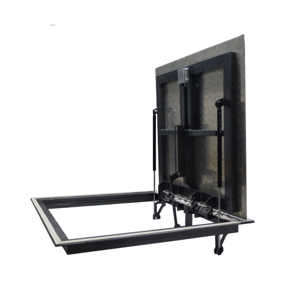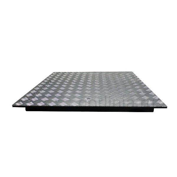 Крышка из алюминия подходит для бетонных полов, потому что не требует дополнительной отделки лицевой части в отличии от скрытых моделей из нашего каталога. Рама в габаритах 790х790 ставится полками уголка на горловину погреба, крепится анкерами по контуру плиты.