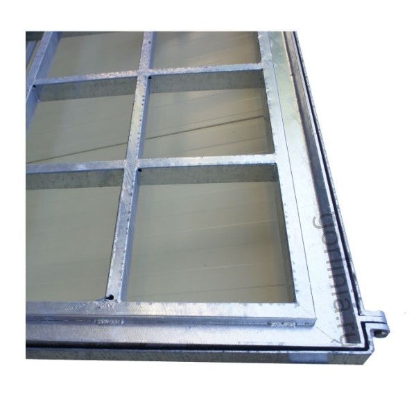 Рама сварена из сортового уголка 50х5. Каркас двери с внешним кантом выполнен с обвязкой из профиля 50х25 с ячейкой в осях 300х300. Дно крышки закрыто оцинкованным листом 2 мм клепочным соединением с расчетной глубиной 20 или 30 мм в зависимости от толщины декинга.
