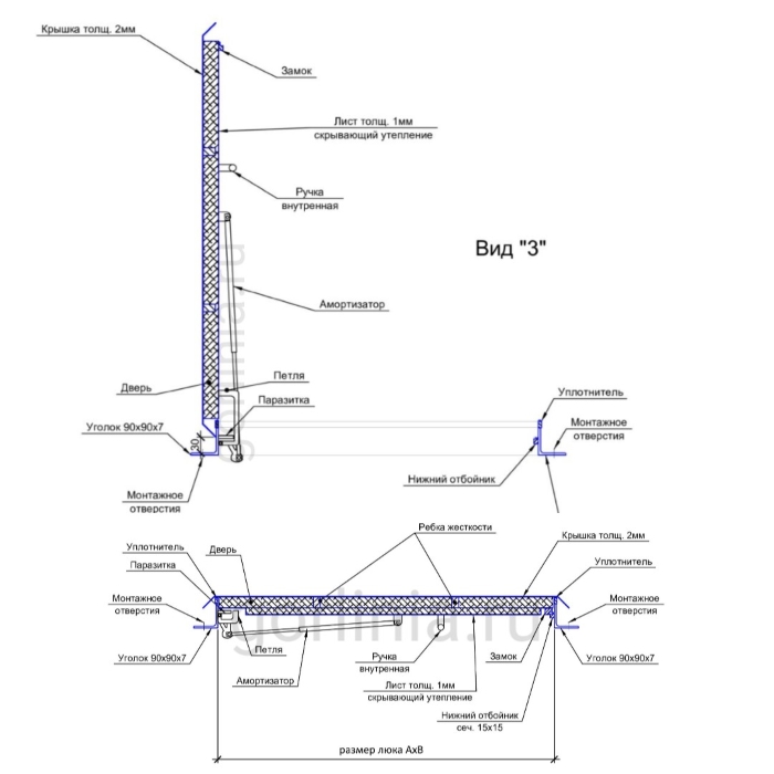 Откидная прямоугольная крышка заполнена сверху гладким кровельным листом 2 мм с загнутыми книзу краями, вылетающими на 25 мм за периметр внешней стенки. Внутри каркаса створки между ребрами обвязки проложен рулонный минеральный утеплитель 50 мм, подшитый снизу листовой сталью 1 мм.