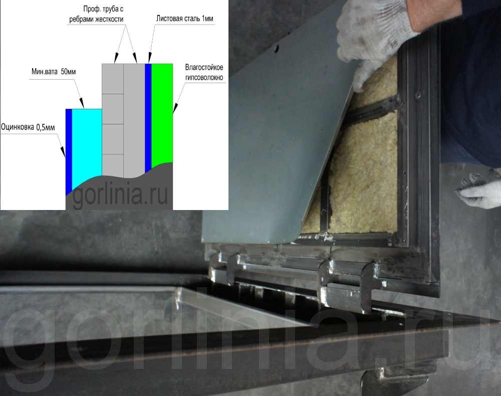 Минеральный утеплитель 50 мм проложен в обвязке каркаса крышки и подшит снизу оцинкованным листом. Под петлями расположен поддон, поэтому уплотнитель проклеен по контуру и тяги из подвала не будет.